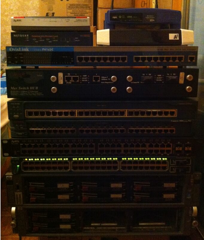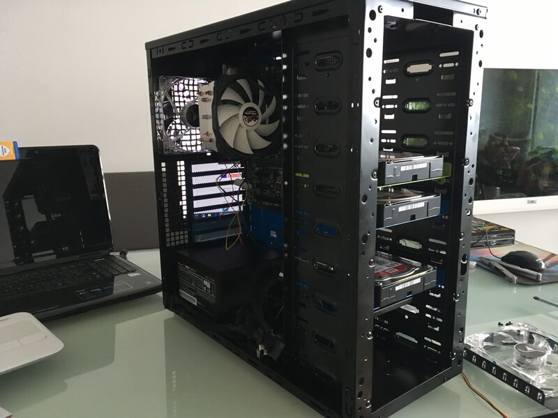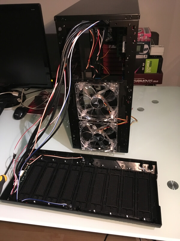 Weiters sind 4x WD-Red Platten (2Stk 3TB und 4TB) verbaut, weitere Netzwerkkarten für VLANs, VPN usw.. sowie ein Arduino zur physischen Kommunikation per Ampel als Statusanzeige und einem Display.