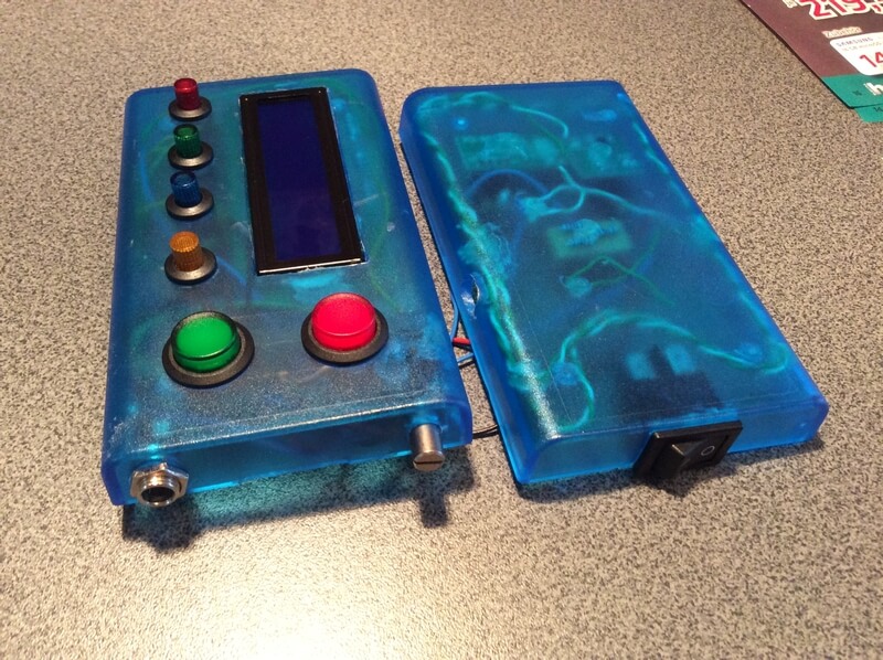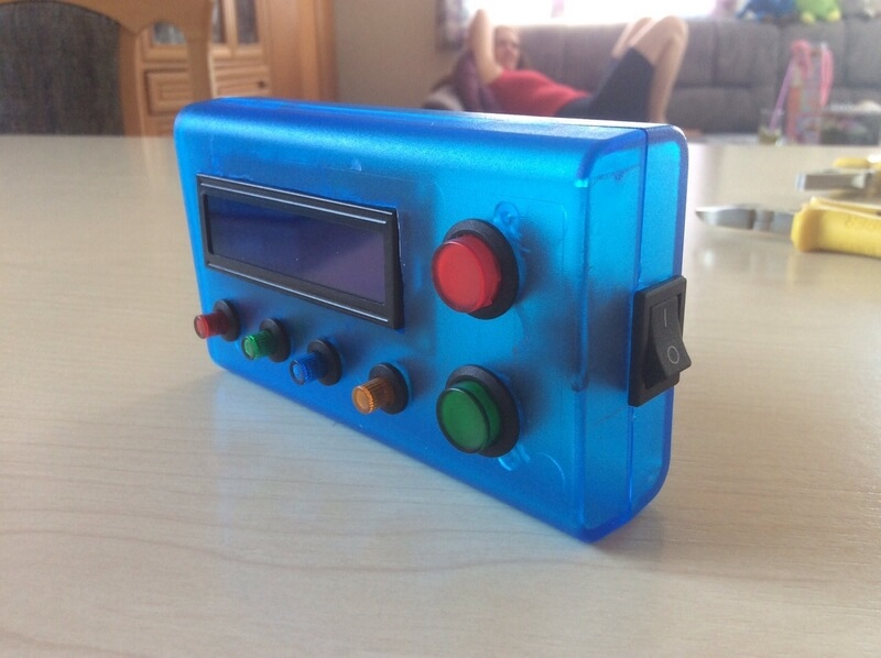 Arduino nano, 433er RX+TX, 4 Menü Taster, 2 Buttons, Ein/Aus-Schalter, DC-IN buchse, 16x2 lcd display, Piezo Speaker.